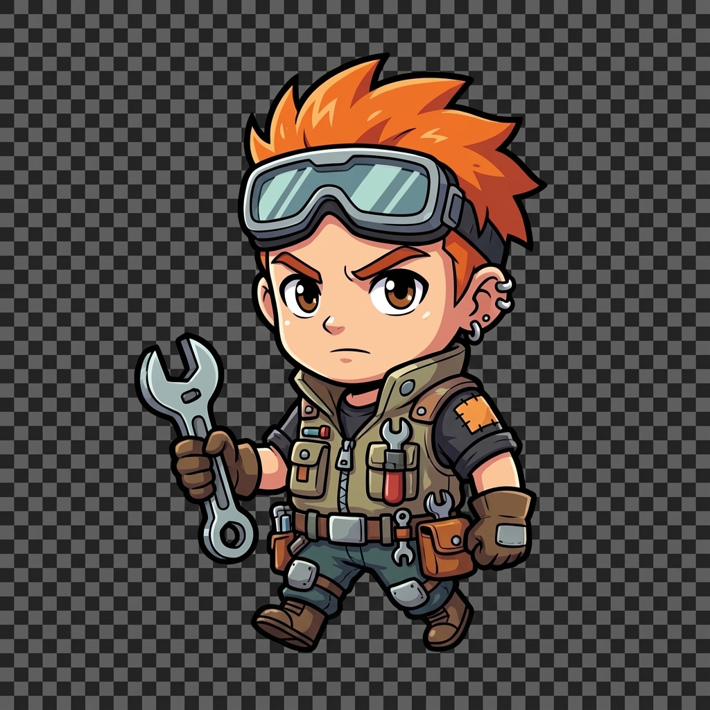- Grey work overalls, tool belt, safety goggles