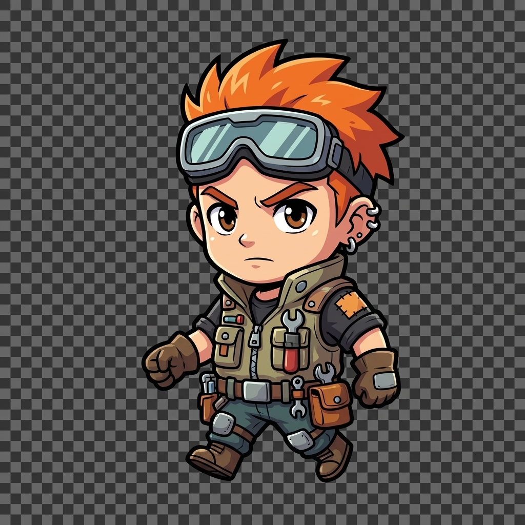 - Grey work overalls, tool belt, safety goggles